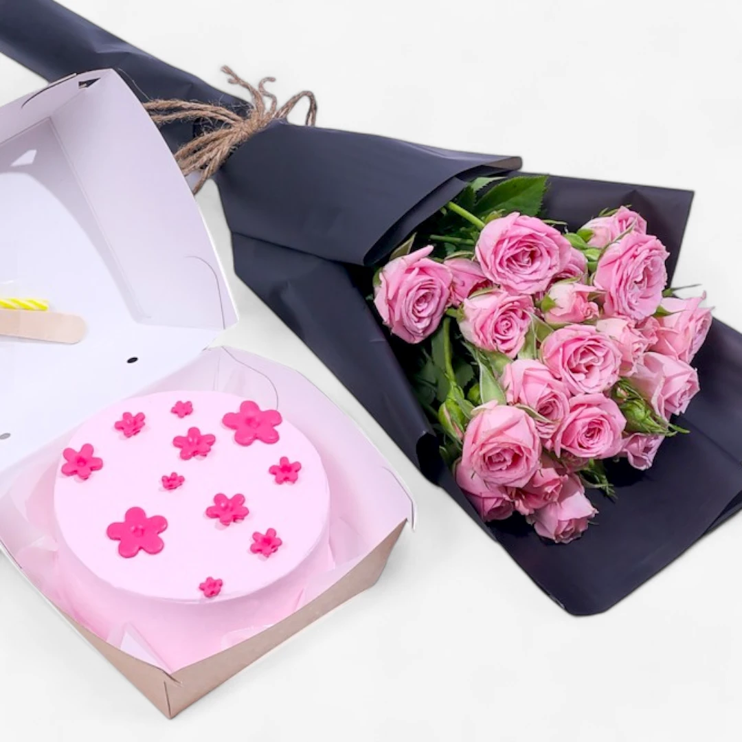 This charming package includes a beautifully illustrated mini cake, adorned with a cute bride-and-groom design, and a stunning bouquet of fresh pink roses wrapped in elegant black paper. Perfect for anniversaries, engagements, weddings, or just because, this bundle combines sweet treats and fresh blooms to make any occasion extra special. Delight someone dear with a gift that speaks of romance and affection.