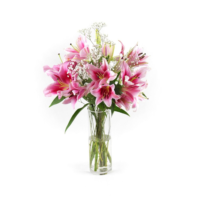 Blossom Radiance – Pink Lilies & Baby’s Breath in Glass Vase