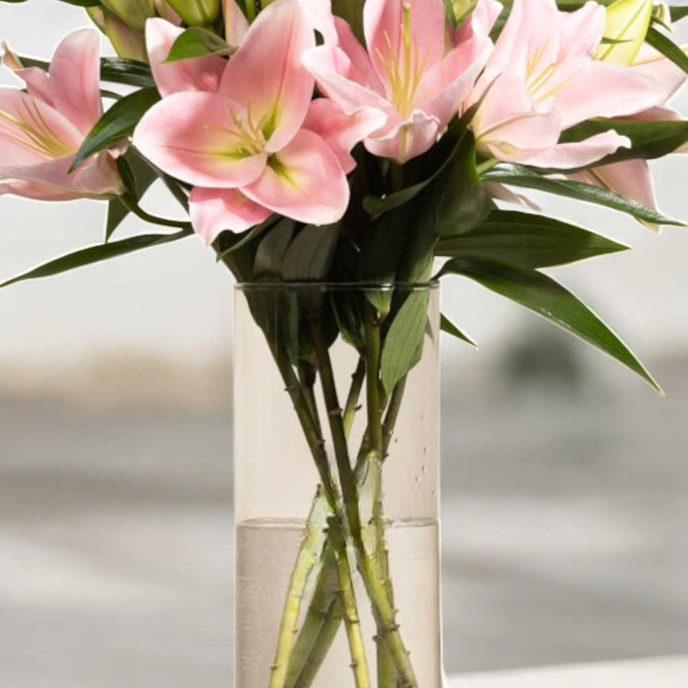 Bring soft elegance into your space with our Blush Bloom Lily Vase – a graceful arrangement of fresh pink lilies nestled in lush green foliage, presented in a sleek cylindrical glass vase. These radiant blooms open gradually, offering a long-lasting floral experience and a subtle, sweet fragrance that enhances any room.