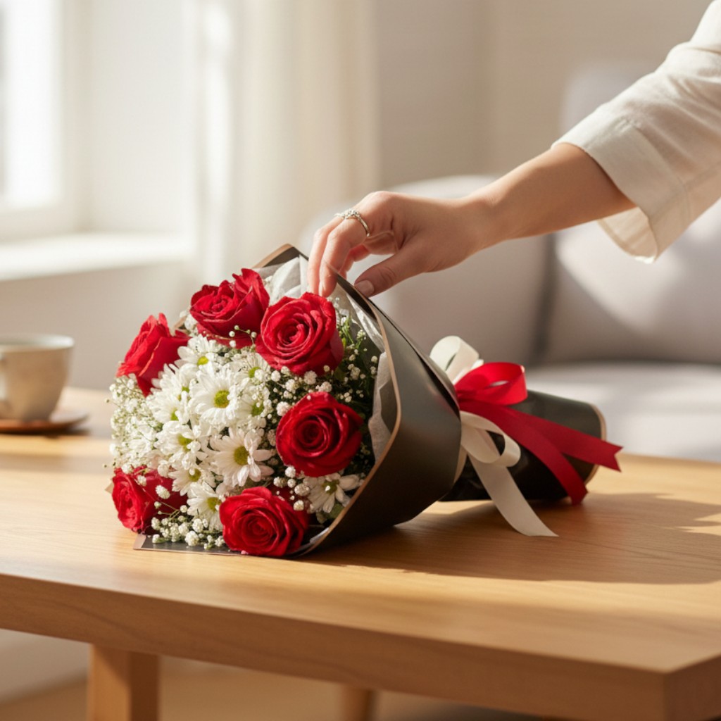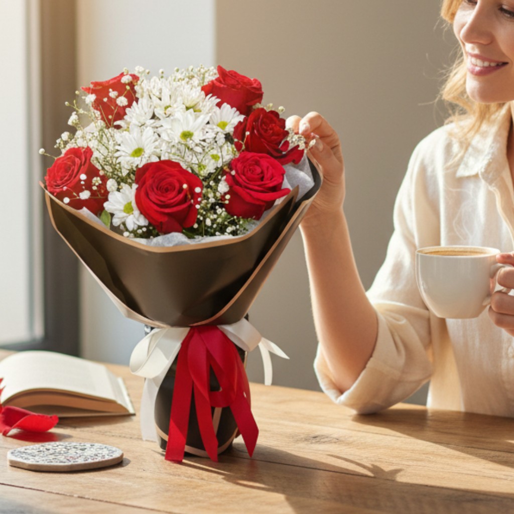 Crimson Harmony – Red Roses & White Daisies Bouquet