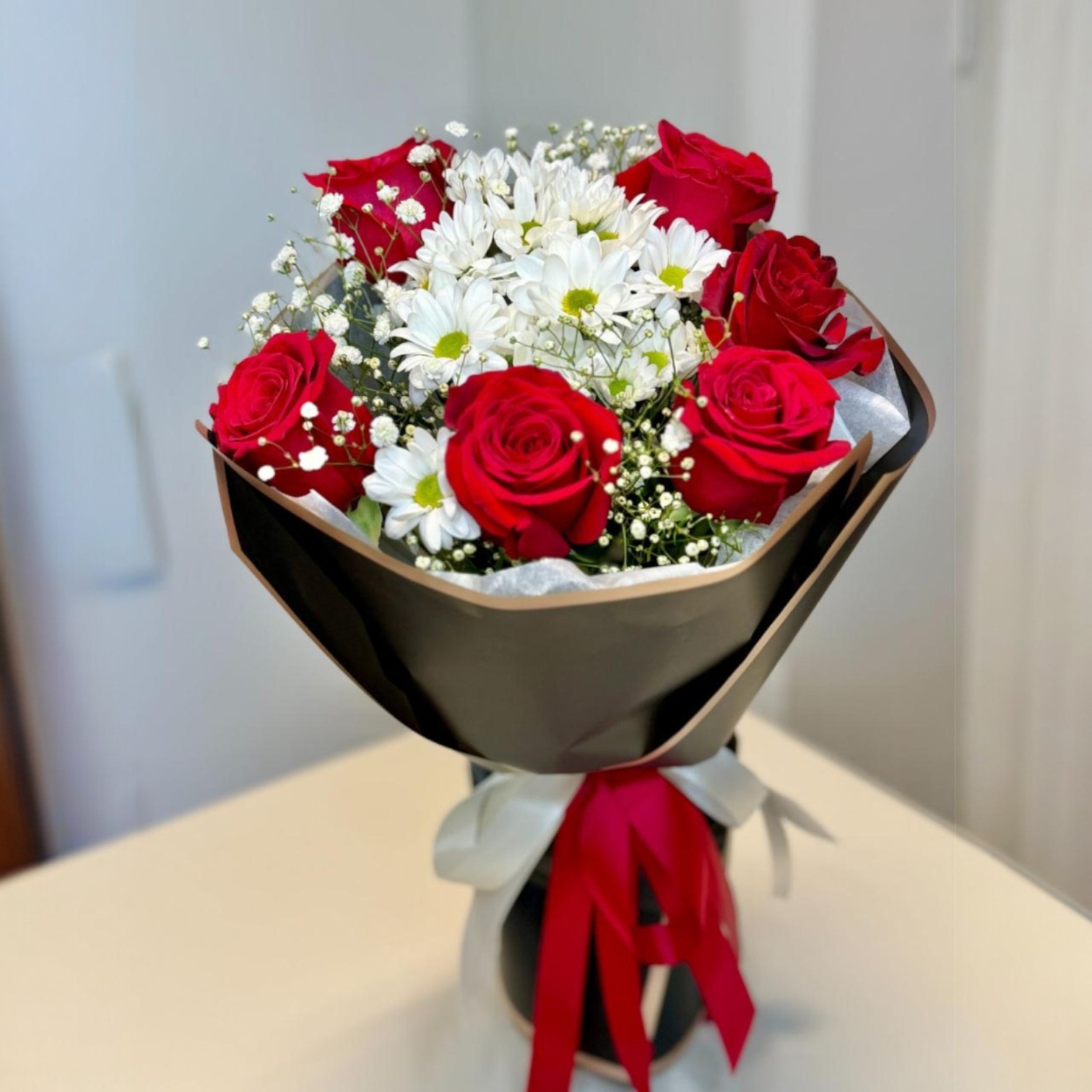 A graceful blend of love and charm, the Crimson Harmony bouquet features velvety red roses paired with delicate white daisies and baby’s breath, all wrapped in a sleek black and gold-toned wrap and finished with an elegant red and white ribbon. Whether it’s a heartfelt gift or a delightful surprise, this bouquet creates a moment of joy in any setting.