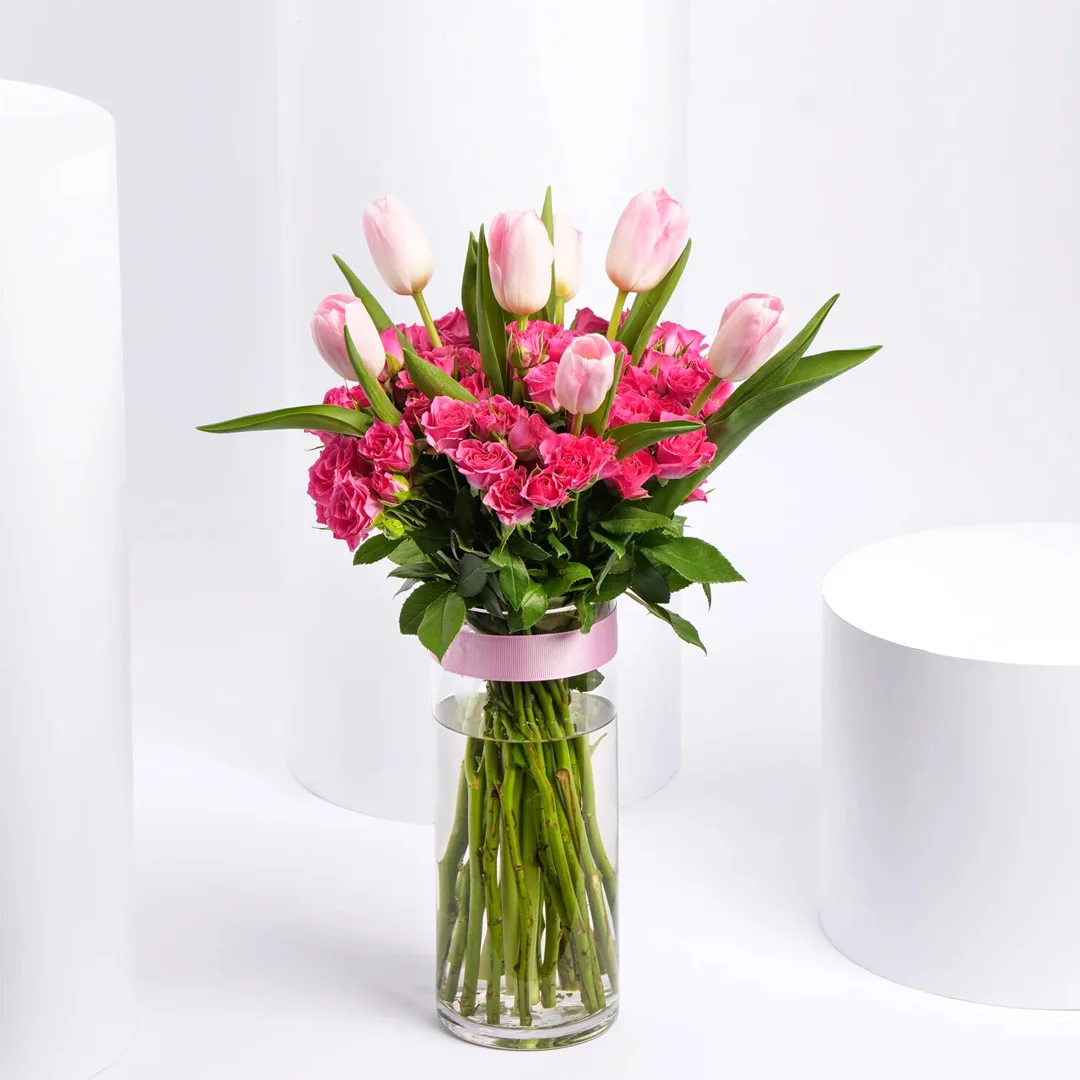 Elegant Pink Tulip And Baby Rose Bouquet In Vase