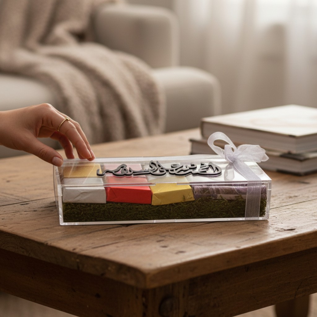 Indulge in luxury with our Elegant Vertical Acrylic Chocolate Box, crafted to impress with its sleek design and rich assortment of chocolates. Featuring a hand-tied white ribbon and a modern Arabic calligraphy accent, this transparent box showcases layers of premium individually wrapped chocolates in gold, silver, red, and blush tones. Perfect for gifting on special occasions like Eid, weddings, corporate events, or as a thoughtful gesture of appreciation.