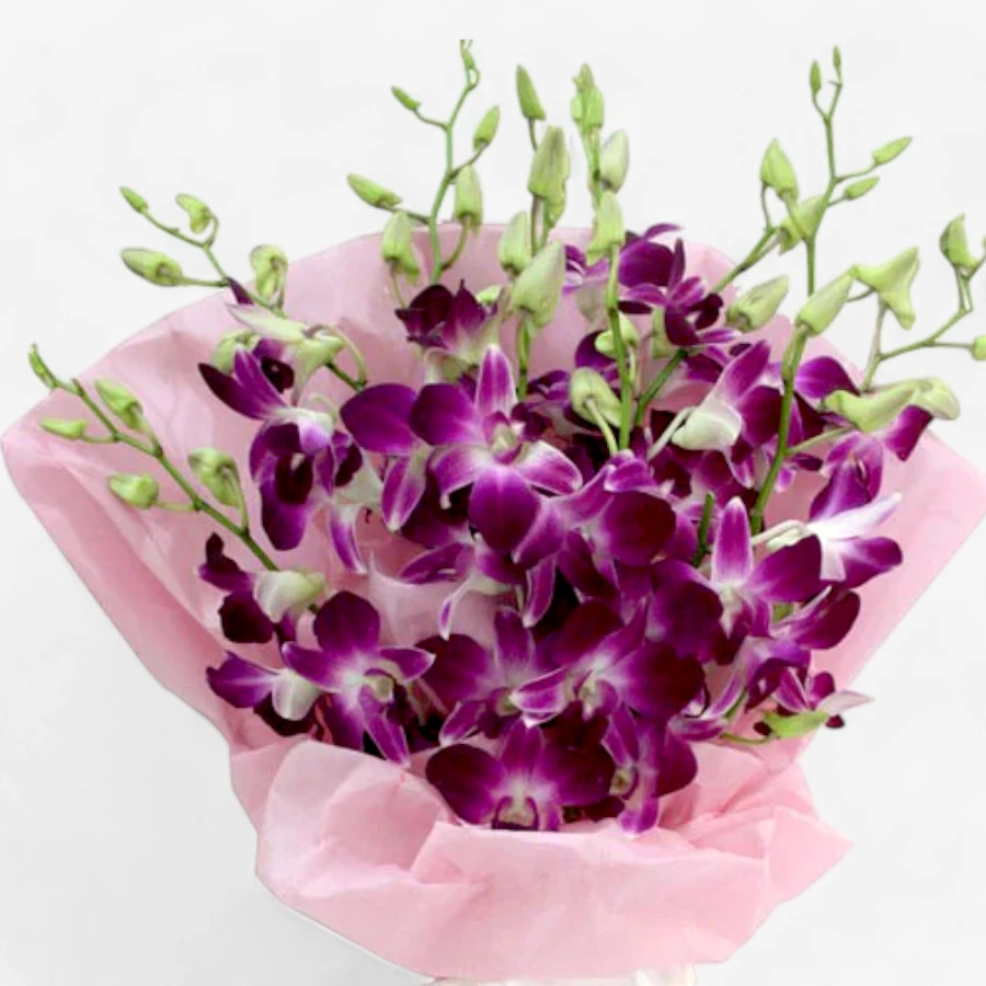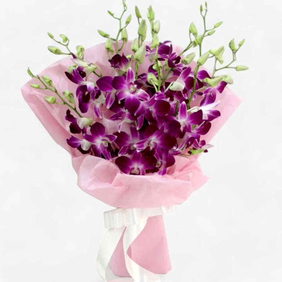 Unveil the elegance of nature with this stunning bouquet of purple orchids, carefully arranged to create a captivating presentation. Perfect for any special occasion, these radiant orchids symbolize beauty, strength, and admiration. Wrapped in soft pink paper and tied with a satin ribbon, this bouquet is sure to leave a lasting impression.