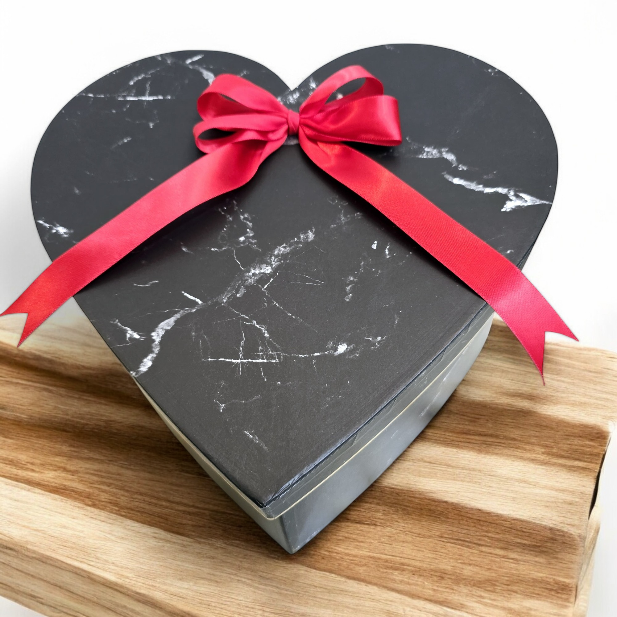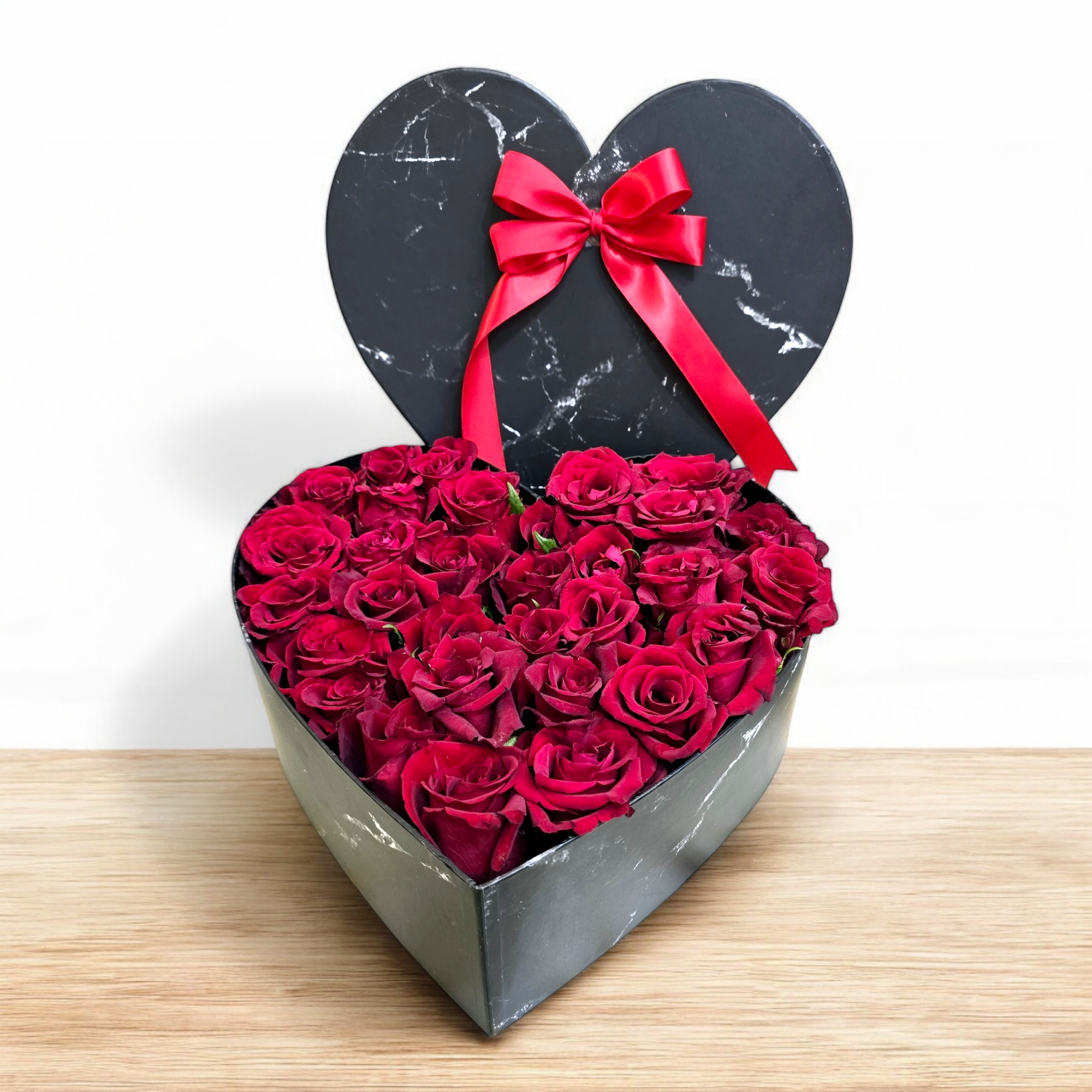 Express your deepest emotions with this luxurious arrangement of 30 fresh red roses beautifully placed in a premium black marble heart-shaped box with a stunning red satin bow.