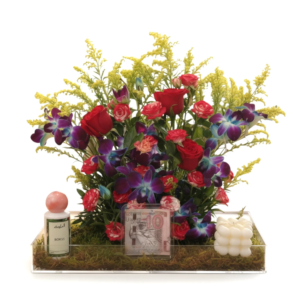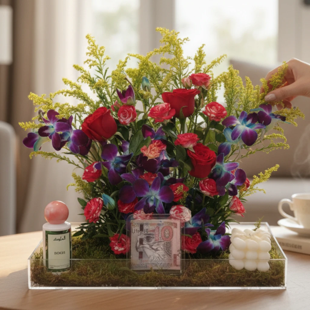 Floral Tray – Red Roses & Orchids Flower Arrangement With Perfume, Candle, Money box(optional)