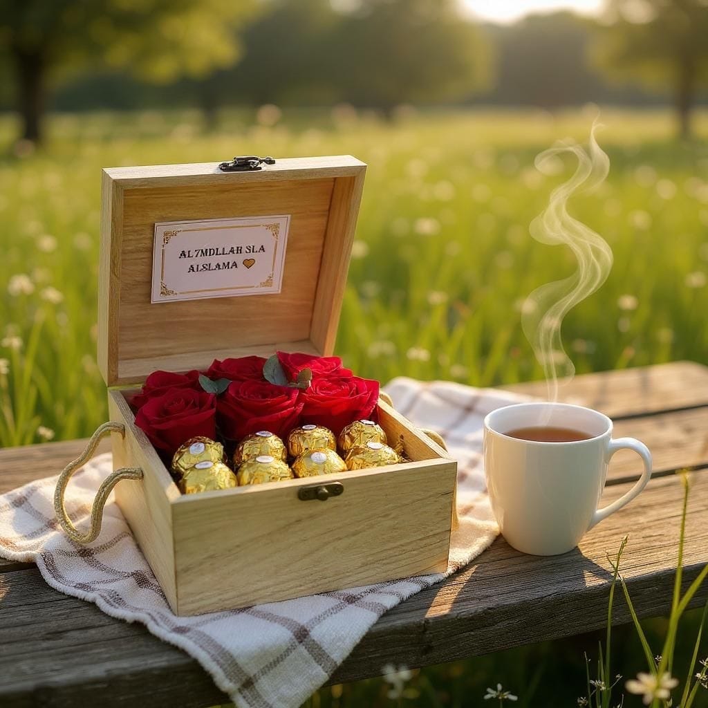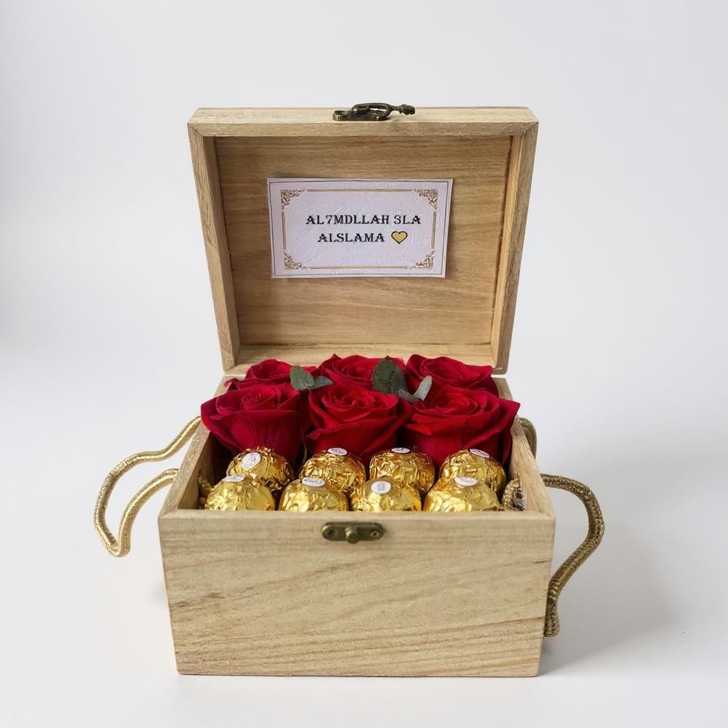 Send warm wishes and heartfelt prayers with the Salama Box, a thoughtful arrangement of fresh red roses and Ferrero Rocher chocolates tucked neatly into a rustic wooden gift box. Complete with a message that reads “Al7mdllah 3la Alslama” (الحمد لله على السلامة), it’s the perfect gesture for a safe recovery, homecoming, or hospital visit.