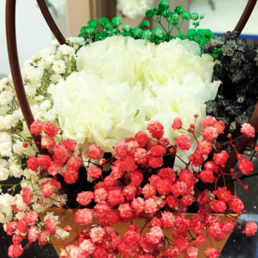 🌿 Vibrant baby’s breath in red, green, black & white creating a unique and artistic floral display
