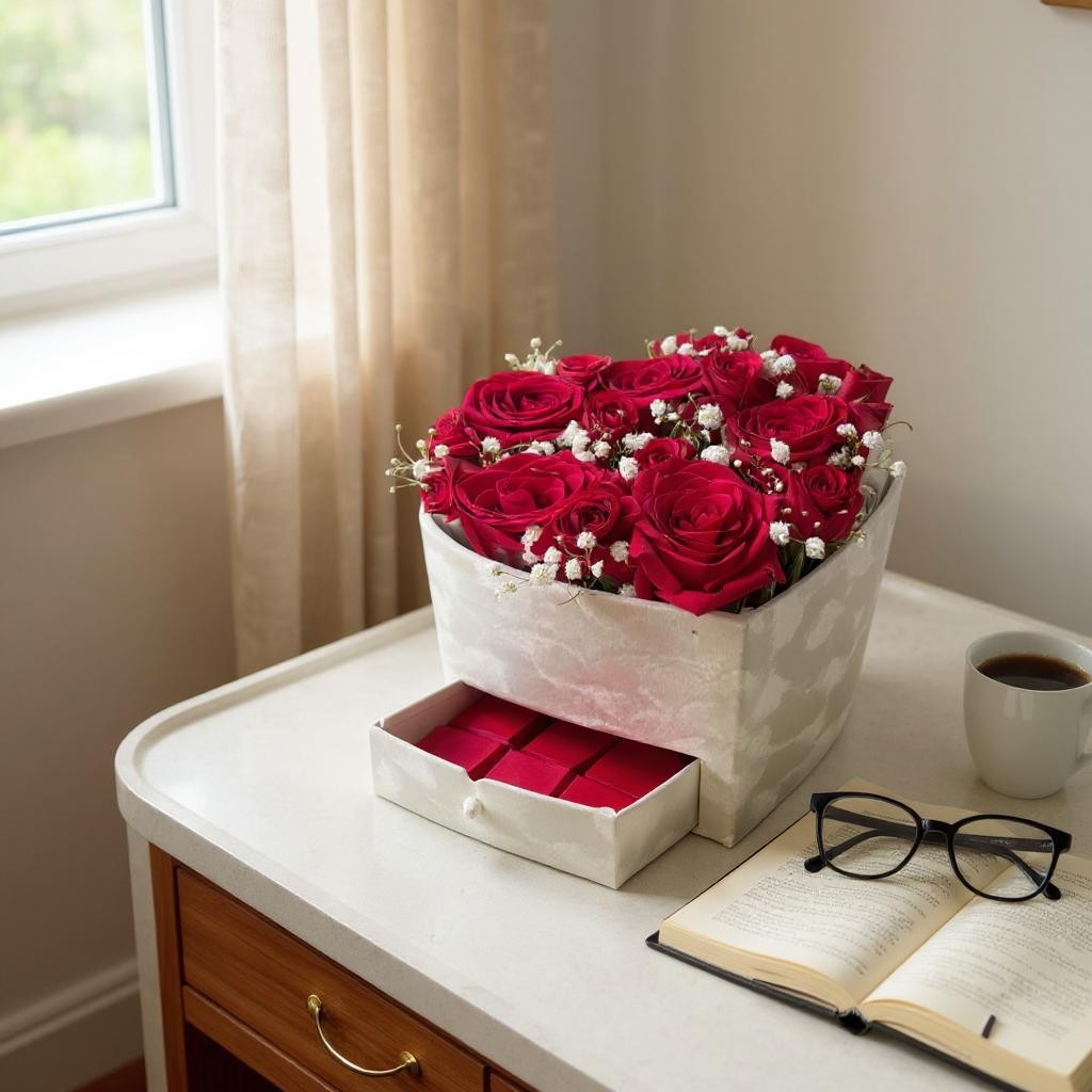 Send your love in the most elegant way with our Heartful Elegance arrangement. A heart-shaped velvet box overflows with vibrant red & White roses and touches of white baby’s breath, while a hidden drawer below reveals delicious chocolates for an extra sweet surprise.
