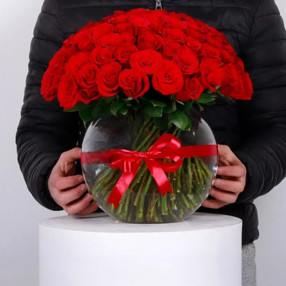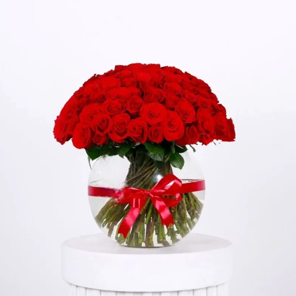 Luxurious 100 Red Roses in Round Glass Vase