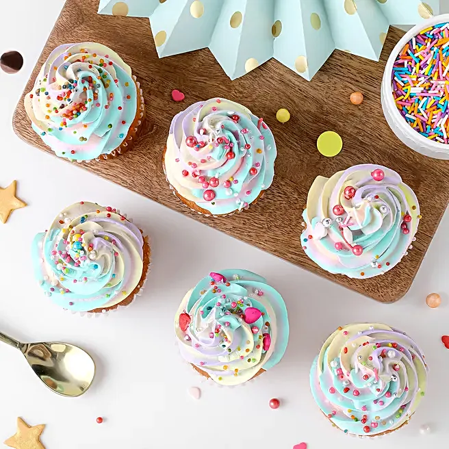 With soft sponge bases and rainbow frosting in hues of lilac, aqua, pink, and vanilla, these cupcakes don’t just taste amazing—they’re made to impress. Every bite is light, fluffy, and perfectly sweet.