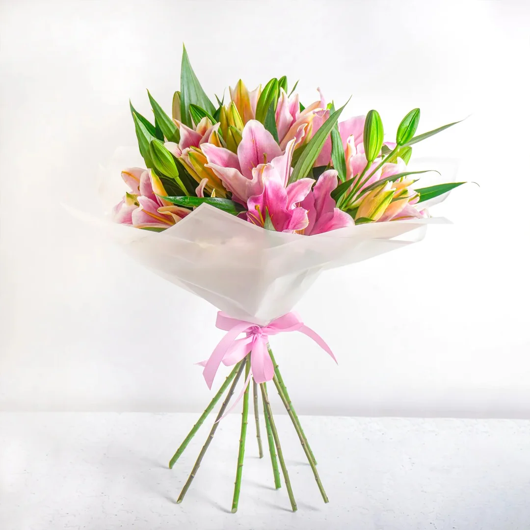 Pink Lily Bouquet In White Wrapping