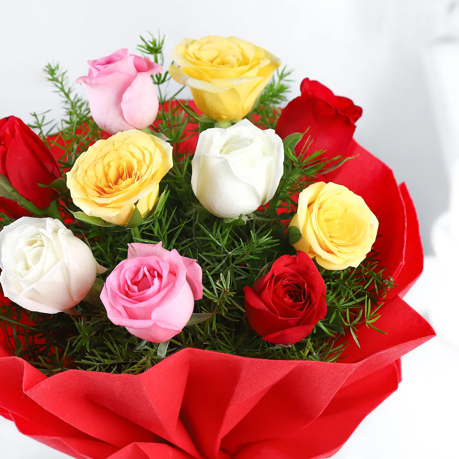 The Radiance Reverie Rose Bouquet is a dazzling collection of colorful roses in shades of red, yellow, pink, and white, all elegantly wrapped in radiant red paper and tied with a charming ribbon. Perfect for a wide range of celebrations, this bouquet brings warmth, happiness, and joy to any occasion. Whether you’re celebrating love, friendship, or simply sending a heartfelt message, this bouquet speaks volumes through its vibrant colors and thoughtful arrangement.
