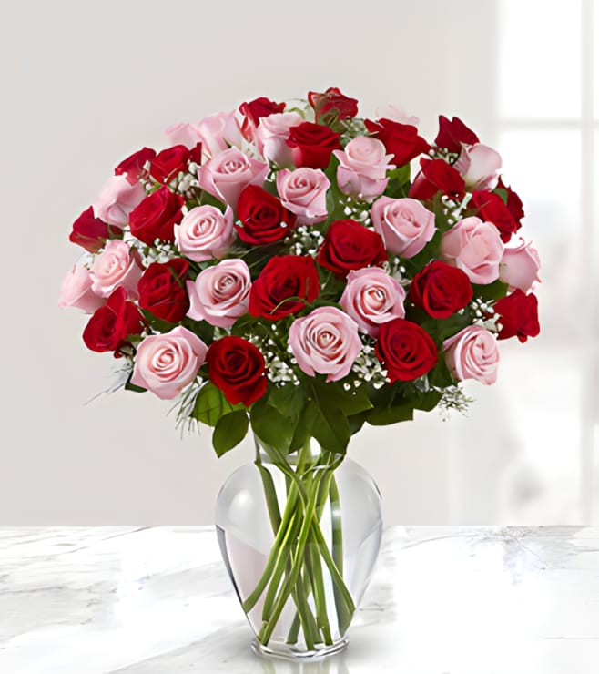 50 Red & Pink Rose Bouquet in Glass Vase