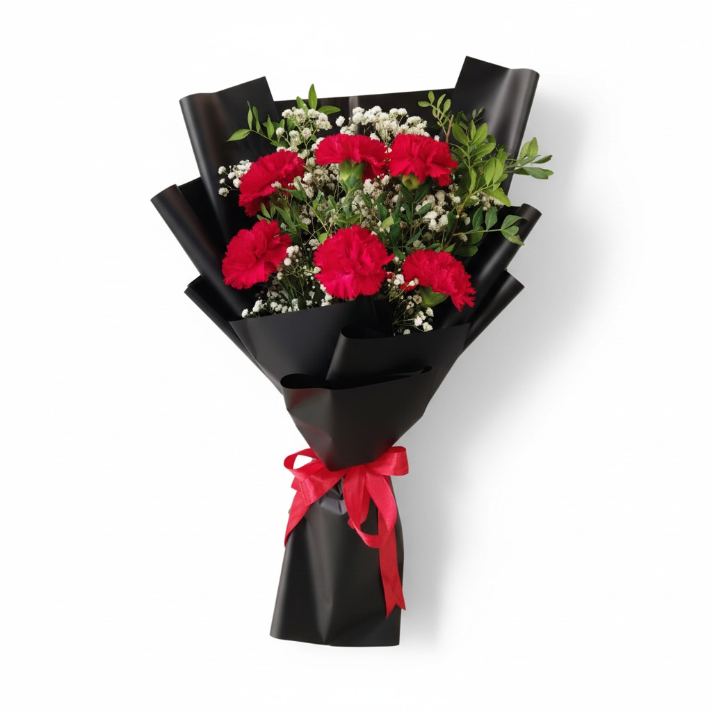 A beautiful bouquet of 6 fresh red carnations wrapped in premium black paper with delicate fillers and a red ribbon. A perfect gift for birthdays, love, appreciation, and special moments.