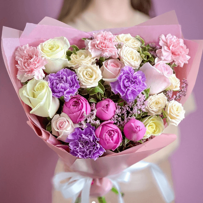 - Includes 10 fresh pink and white roses, complemented by purple carnations and filler flowers.