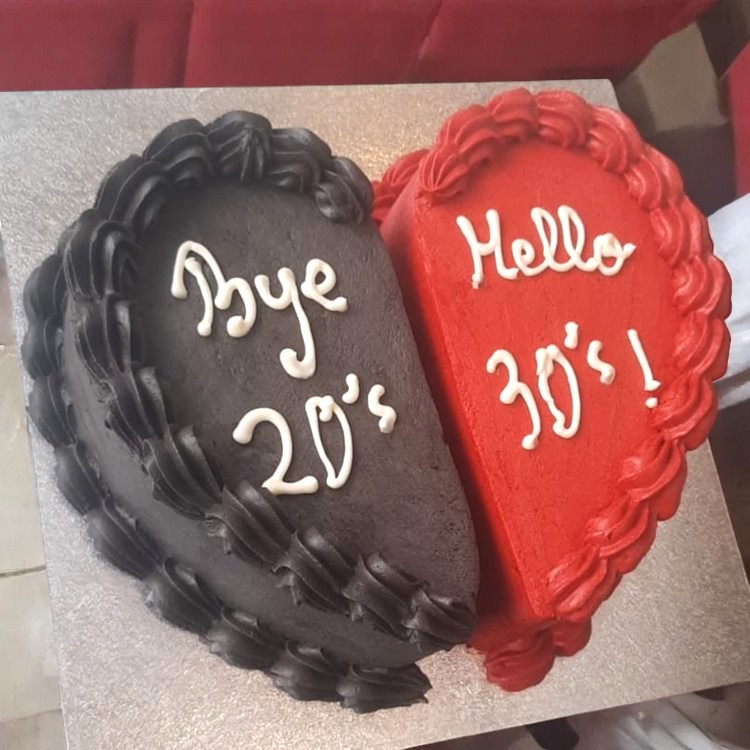Turning 30 never looked this sweet (and savage)! Our Cake is a fun and fabulous heart-shaped split cake—half bold black, half fierce red—perfectly iced with a cheeky message to say goodbye to your twenties and welcome a brand new decade.