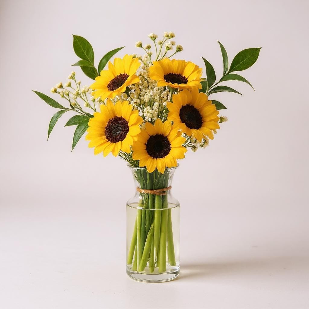Bring warmth and positivity into any room with our Sunshine Glow arrangement – a cheerful bouquet of radiant sunflowers paired with delicate white fillers and fresh greenery. Presented in a clear glass vase, this vibrant design is a symbol of joy, hope, and happiness.