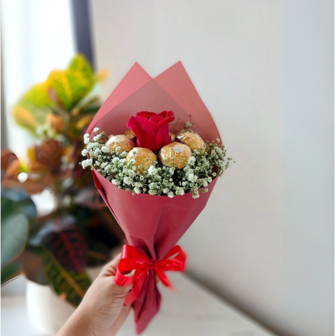 A charming expression of love and sweetness, this mini bouquet features a single bold red rose surrounded by delicate baby’s breath and five irresistible Ferrero Rocher chocolates. Wrapped in crisp red paper and tied with a red satin ribbon, it’s a perfect gift for quick surprises, romantic gestures, or thoughtful tokens of appreciation.